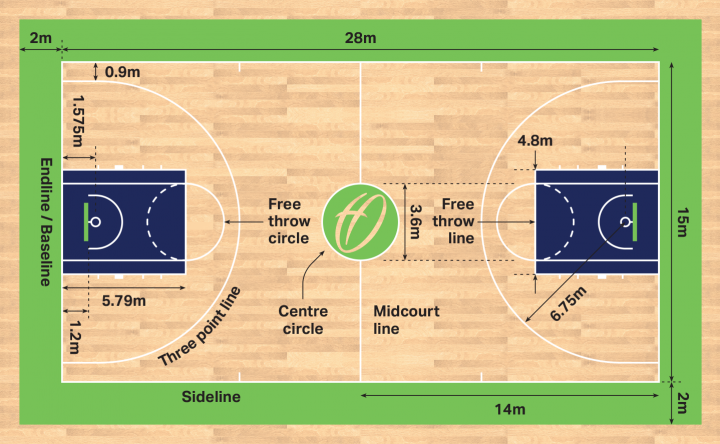 The outer edge of the court is denoted by the sidelines, which run the length of the court. On a full-sized court they measure 28m.