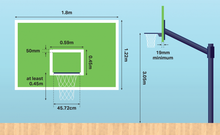 The basketball goal (also known as a ring or hoop) is typically 18 inches (45.72cm) in diameter and must be positioned 3.05m from the floor.